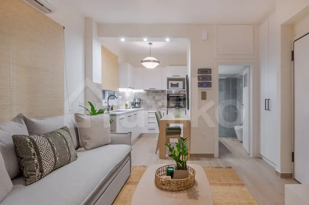 Το διαμέρισμα διαθέτει 1 υπνοδωμάτιο, ενιαία κουζίνα με σαλόνι και 1 μπάνιο. Έχει πλήρως ανακαινιστεί το 2022 και διατίθεται επιπλωμένο, με ηλεκτρικές συσκευές και πόρτα ασφαλείας. Περιλαμβάνει κλιματισμό, κουφώματα αλουμινίου με διπλά τζάμια, δάπεδα από πλακάκι και ενεργειακή κλάση Α. Είναι προσόψεως και φωτεινό, ενώ αυτή τη στιγμή είναι μισθωμένο, καθιστώντας το άμεσα αποδοτικό.