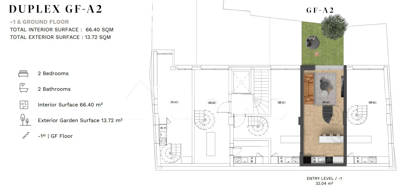 Στο Παγκράτι, σε έναν γαλήνιο πεζόδρομο κοντά στο Καλλιμάρμαρο, συναντάμε τη μεζονέτα GF-A2, συνολικής επιφάνειας 66,4τ.μ., σε σύγχρονο συγκρότημα κατοικιών. Το εξαώροφο κτίριο ενσωματώνει νεοκλασική γοητεία και εκλεπτυσμένη αρχιτεκτονική, συνδυάζοντας την αισθητική με τη λειτουργικότητα. Η κατοικία εκτείνεται σε δύο επίπεδα (υπόγειο -1 και ισόγειο) και προσφέρει δύο υπνοδωμάτια και ένα μπάνιο, ιδανικά για ζευγάρια ή μικρές οικογένειες. Ο εσωτερικός σχεδιασμός εξασφαλίζει άπλετο φως και άνεση, ενώ ο κηπος 13.72 τ.μ. δημιουργεί μια ιδιωτική όαση χαλάρωσης στο κέντρο της πόλης. Η τοποθεσία της κατοικίας είναι μοναδική, σε μικρή απόσταση από το κέντρο της Αθήνας, αλλά ταυτόχρονα σε μια ήσυχη και εκλεπτυσμένη γειτονιά, όπου η ιστορία και ο σύγχρονος τρόπος ζωής συναντιούνται.