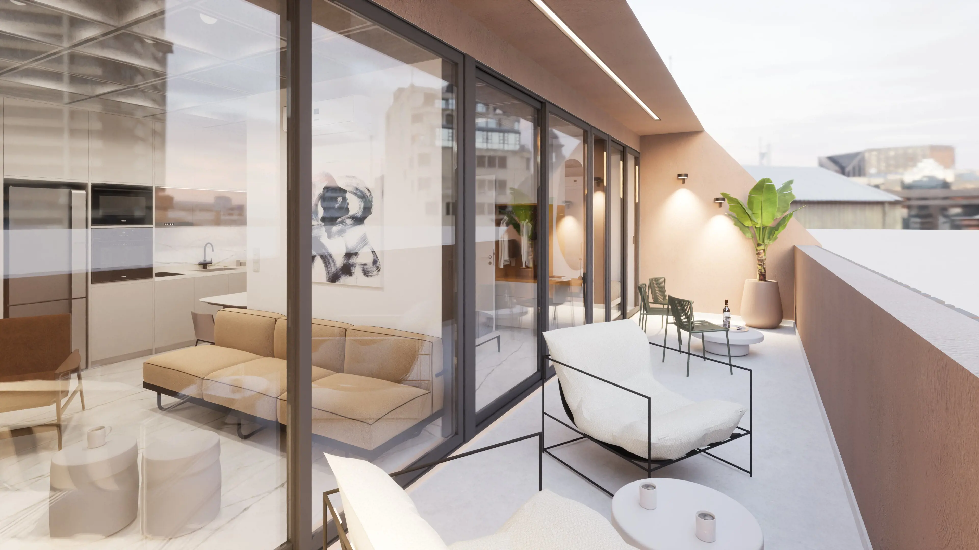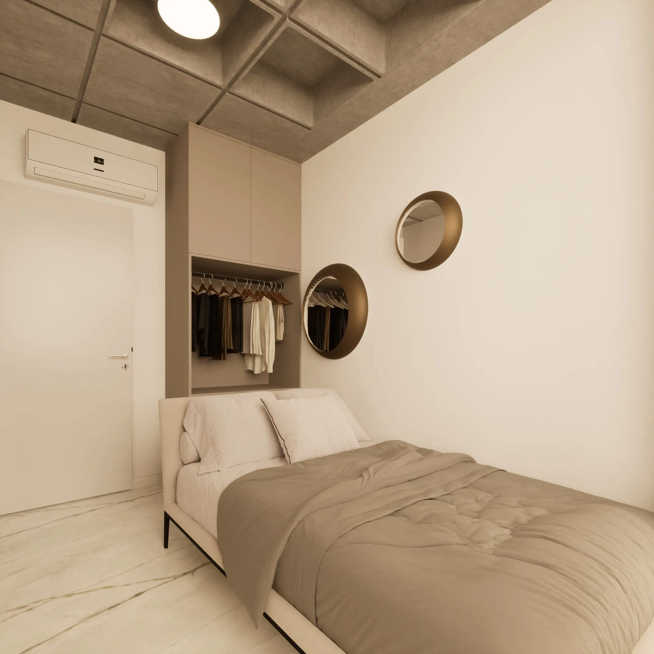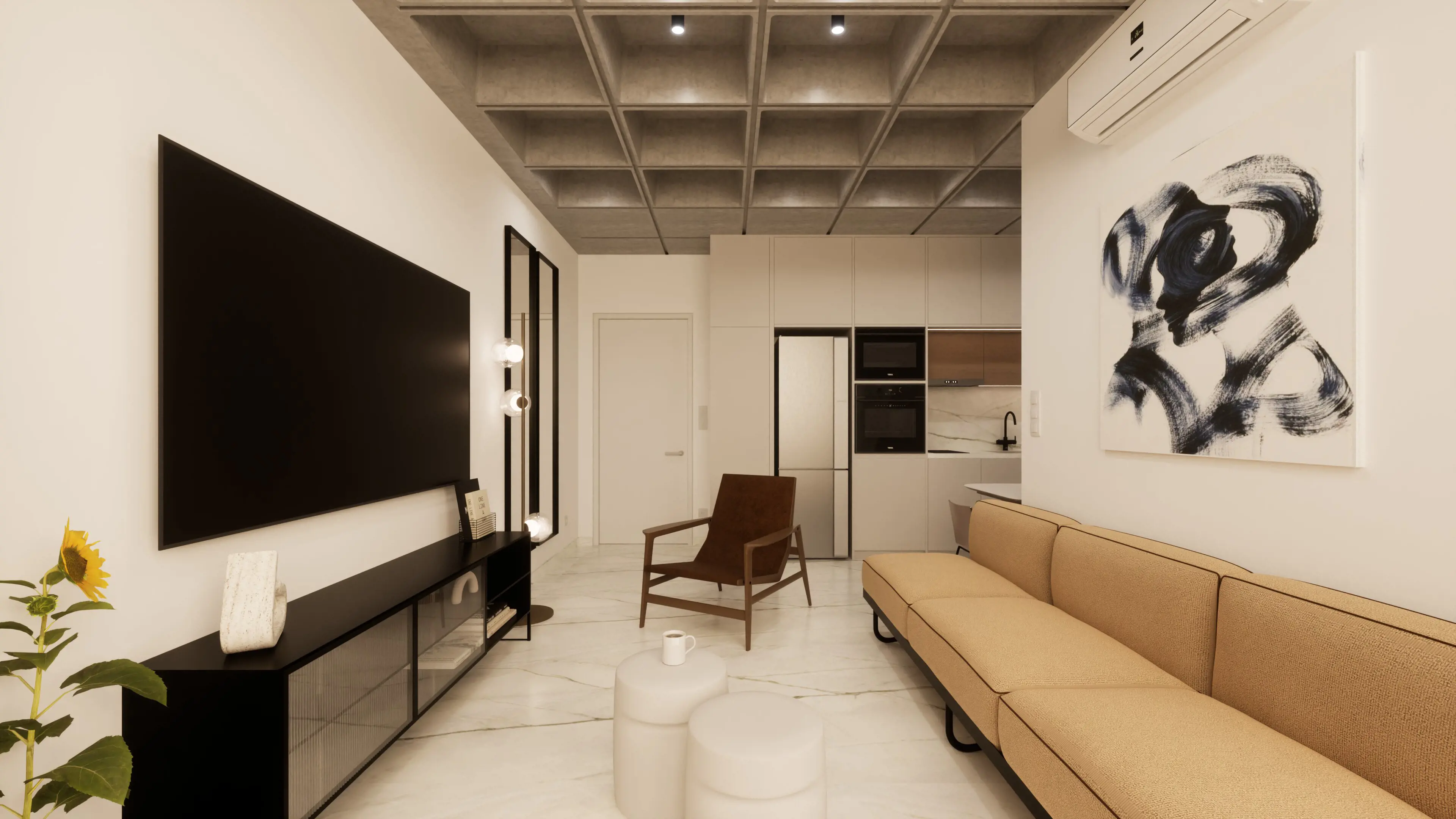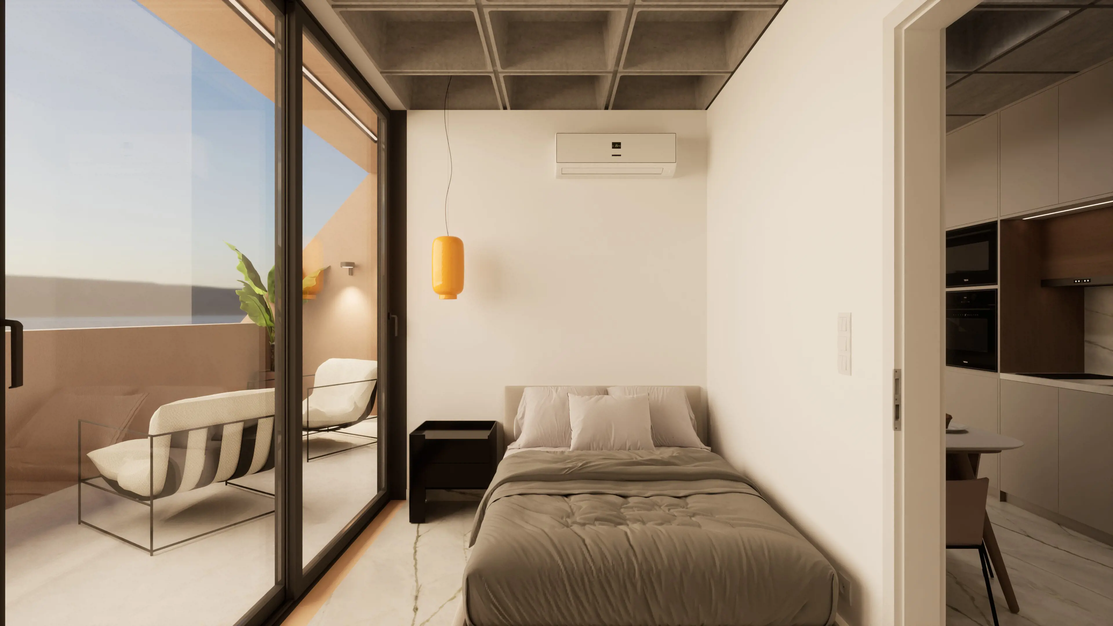 This unique 108 sqm apartment (48 sq.m. internal space και 60 sq.m. private roof terrace) was originally part of a commercial office building, now transformed into a modern residential space. It features a smart layout with 1 bedroom, 1 bathroom, and an open-plan kitchen, and comes fully furnished. Residents also enjoy access to a shared gym and their own private rooftop terrace, perfect for relaxation. - E1
