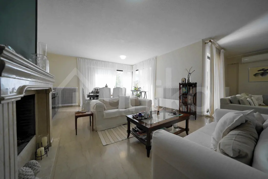 For sale: a stunning 188 sq.m. first-floor apartment in Aixoni, Glyfada. This is a spacious, very well-maintained and preserved floor apartment, corner-positioned and front-facing, built in 1981. It features a large central area with two comfortable living rooms, one with a fireplace, and an elegant dining area. Large windows and balcony doors throughout make it extremely bright, offering access to two spacious balconies. There is a modern guest w/c, and the kitchen is independent with an internal dining area, seating area, and storage room. The large balcony accommodates an outdoor dining area and a sitting area. A hallway leads to three bedrooms, including a master bedroom with an en-suite bathroom, and there is another full bathroom for the other bedrooms. All bedrooms have access to balconies overlooking the lush green garden with lawn and trees.