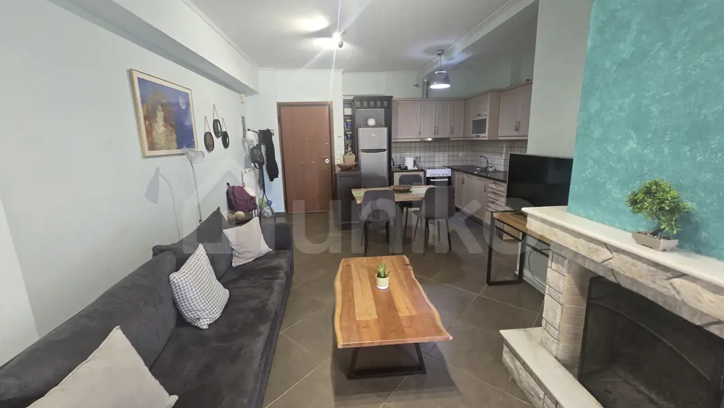 A 48.5 sq.m. apartment is available for sale on the 4th floor of a well-maintained 2006 building. The layout includes one bedroom, a living room with fireplace, kitchen, and bathroom. It features a balcony with open views and awnings, aluminum frames with double glazing, tile floors, autonomous oil heating, and air conditioning. The apartment also comes with a 3 sq.m. storage room in the basement, a security door, video intercom, and elevator access.